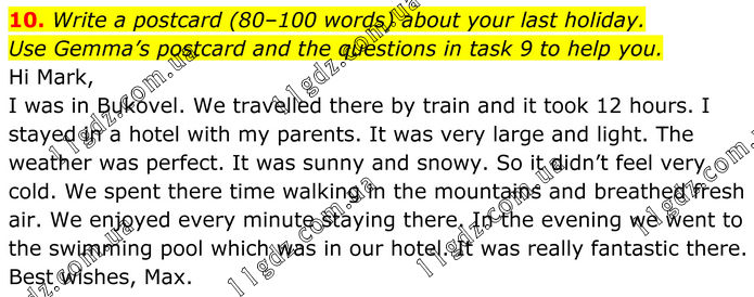 Write a postcard (80–100 words) about your last holiday. Use Gemma’s postcard and the questions in task 9 to help you. Hi Mark, I was in Bukovel. We travelled there by train and it took 12 hours. I stayed in a hotel with my parents. It was very large and light. The weather was perfect. It was sunny and snowy. So it didn’t feel very cold. We spent there time walking in the mountains and breathed fresh air. We enjoyed every minute staying there. In the evening we went to the swimming pool which was in our hotel. It was really fantastic there. Best wishes, Max.