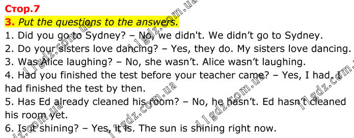 Put the questions to the answers. 1. Did you go to Sydney? – No, we didn't. We didn’t go to Sydney. 2. Do your sisters love dancing? – Yes, they do. My sisters love dancing. 3. Was Alice laughing? – No, she wasn’t. Alice wasn’t laughing. 4. Had you finished the test before your teacher came? – Yes, I had. I had finished the test by then. 5. Has Ed already cleaned his room? – No, he hasn’t. Ed hasn’t cleaned his room yet. 6. Is it shining? – Yes, it is. The sun is shining right now.