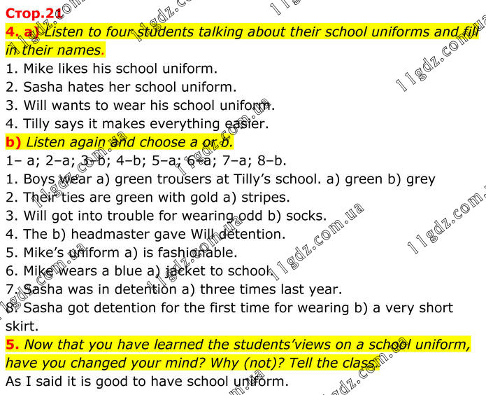 4. a) Listen to four students talking about their school uniforms and fill in their names. 1. Mike likes his school uniform. 2. Sasha hates her school uniform. 3. Will wants to wear his school uniform. 4. Tilly says it makes everything easier. b) Listen again and choose a or b. 1– a; 2–a; 3–b; 4–b; 5–a; 6–a; 7–a; 8–b. 1. Boys wear a) green trousers at Tilly’s school. a) green b) grey 2. Their ties are green with gold a) stripes. 3. Will got into trouble for wearing odd b) socks. 4. The b) headmaster gave Will detention. 5. Mike’s uniform a) is fashionable. 6. Mike wears a blue a) jacket to school. 7. Sasha was in detention a) three times last year. 8. Sasha got detention for the first time for wearing b) a very short skirt. 5. Now that you have learned the students’views on a school uniform, have you changed your mind? Why (not)? Tell the class. As I said it is good to have school uniform.