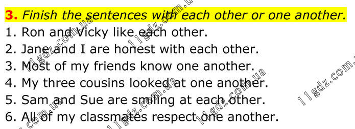 3. Finish the sentences with each other or one another. 1. Ron and Vicky like each other. 2. Jane and I are honest with each other. 3. Most of my friends know one another. 4. My three cousins looked at one another. 5. Sam and Sue are smiling at each other. 6. All of my classmates respect one another.
