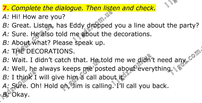 7. Complete the dialogue. Then listen and check. A: Hi! How are you? B: Great. Listen, has Eddy dropped you a line about the party? A: Sure. He also told me about the decorations. B: About what? Please speak up. A: THE DECORATIONS. B: Wait. I didn’t catch that. He told me we didn’t need any. A: Well, he always keeps me posted about everything. B: I think I will give him a call about it. A: Sure. Oh! Hold on, Jim is calling. I’ll call you back. B: Okay.