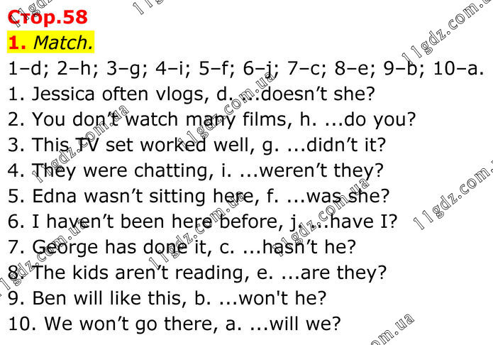1. Match. 1–d; 2–h; 3–g; 4–i; 5–f; 6–j; 7–c; 8–e; 9–b; 10–a. 1. Jessica often vlogs, d. ...doesn’t she? 2. You don’t watch many films, h. ...do you? 3. This TV set worked well, g. ...didn’t it? 4. They were chatting, i. ...weren’t they? 5. Edna wasn’t sitting here, f. ...was she? 6. I haven’t been here before, j. ...have I? 7. George has done it, c. ...hasn’t he? 8. The kids aren’t reading, e. ...are they? 9. Ben will like this, b. ...won't he? 10. We won’t go there, a. ...will we?