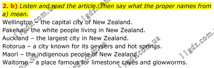 2. b) Listen and read the article. Then say what the proper names from a) mean. Wellington – the capital city of New Zealand. Pakeha – the white people living in New Zealand. Auckland – the largest city in New Zealand. Rotorua – a city known for its geysers and hot springs. Maori – the indigenous people of New Zealand. Waitomo – a place famous for limestone caves and glowworms.