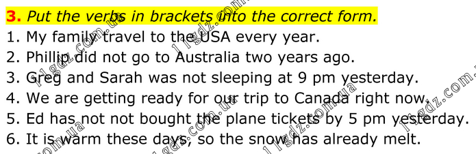 3. Put the verbs in brackets into the correct form. 1. My family travel to the USA every year. 2. Phillip did not go to Australia two years ago. 3. Greg and Sarah was not sleeping at 9 pm yesterday. 4. We are getting ready for our trip to Canada right now. 5. Ed has not not bought the plane tickets by 5 pm yesterday. 6. It is warm these days, so the snow has already melt.