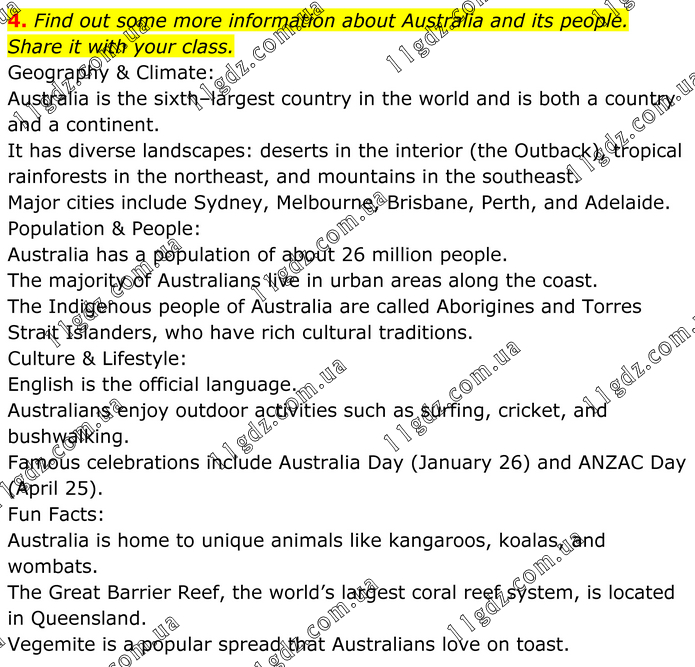 4. Find out some more information about Australia and its people. Share it with your class. Geography & Climate: Australia is the sixth–largest country in the world and is both a country and a continent. It has diverse landscapes: deserts in the interior (the Outback), tropical rainforests in the northeast, and mountains in the southeast. Major cities include Sydney, Melbourne, Brisbane, Perth, and Adelaide. Population & People: Australia has a population of about 26 million people. The majority of Australians live in urban areas along the coast. The Indigenous people of Australia are called Aborigines and Torres Strait Islanders, who have rich cultural traditions. Culture & Lifestyle: English is the official language. Australians enjoy outdoor activities such as surfing, cricket, and bushwalking. Famous celebrations include Australia Day (January 26) and ANZAC Day (April 25). Fun Facts: Australia is home to unique animals like kangaroos, koalas, and wombats. The Great Barrier Reef, the world’s largest coral reef system, is located in Queensland. Vegemite is a popular spread that Australians love on toast.