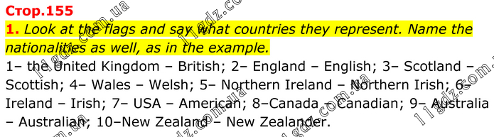 1. Look at the flags and say what countries they represent. Name the nationalities as well, as in the example. 1– the United Kingdom – British; 2– England – English; 3– Scotland – Scottish; 4– Wales – Welsh; 5– Northern Ireland – Northern Irish; 6– Ireland – Irish; 7– USA – American; 8–Canada – Canadian; 9– Australia – Australian; 10–New Zealand – New Zealander.