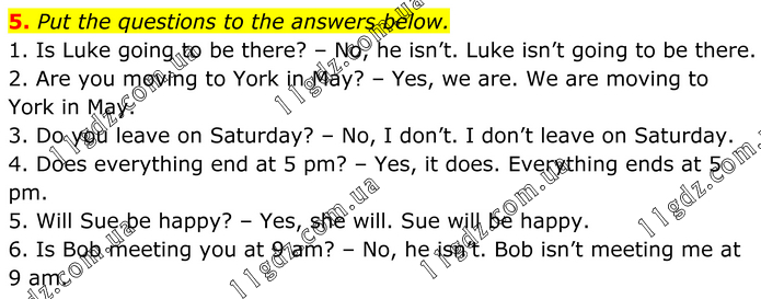 5. Put the questions to the answers below. 1. Is Luke going to be there? – No, he isn’t. Luke isn’t going to be there. 2. Are you moving to York in May? – Yes, we are. We are moving to York in May. 3. Do you leave on Saturday? – No, I don’t. I don’t leave on Saturday. 4. Does everything end at 5 pm? – Yes, it does. Everything ends at 5 pm. 5. Will Sue be happy? – Yes, she will. Sue will be happy. 6. Is Bob meeting you at 9 am? – No, he isn’t. Bob isn’t meeting me at 9 am.