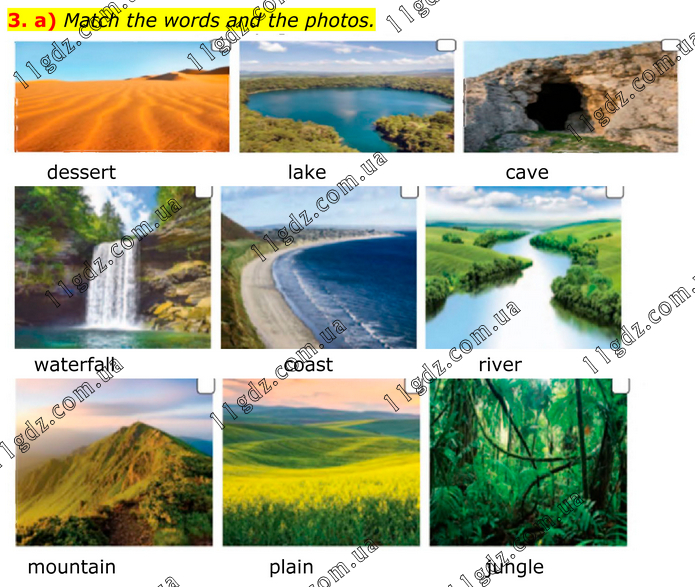 3. a) Match the words and the photos. dessert lake cave waterfall coast river mountain plain jungle