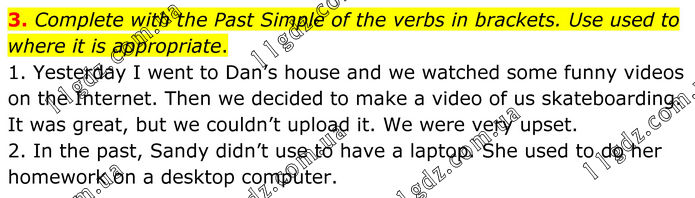 Complete with the Past Simple of the verbs in brackets. Use used to where it is appropriate. 1. Yesterday I went to Dan’s house and we watched some funny videos on the Internet. Then we decided to make a video of us skateboarding. It was great, but we couldn’t upload it. We were very upset. 2. In the past, Sandy didn’t use to have a laptop. She used to do her homework on a desktop computer.