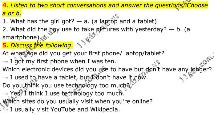 4. Listen to two short conversations and answer the questions. Choose a or b. 1. What has the girl got? — a. (a laptop and a tablet) 2. What did the boy use to take pictures with yesterday? — b. (a smartphone) 5. Discuss the following. At what age did you get your first phone/ laptop/tablet? → I got my first phone when I was ten. Which electronic devices did you use to have but don’t have any longer? → I used to have a tablet, but I don’t have it now. Do you think you use technology too much? → Yes, I think I use technology too much. Which sites do you usually visit when you’re online? → I usually visit YouTube and Wikipedia.
