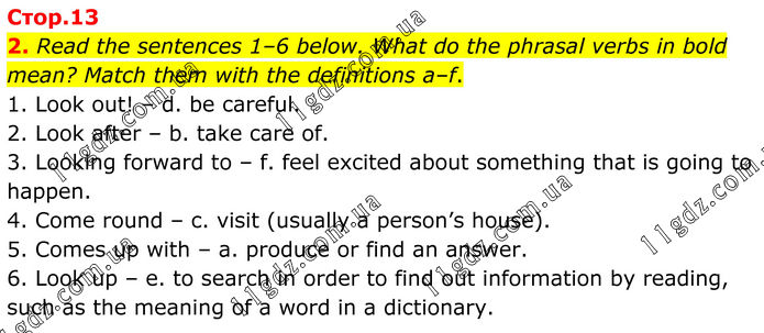2. Read the sentences 1–6 below. What do the phrasal verbs in bold mean? Match them with the definitions a–f. 1. Look out! – d. be careful. 2. Look after – b. take care of. 3. Looking forward to – f. feel excited about something that is going to happen. 4. Come round – c. visit (usually a person’s house). 5. Comes up with – a. produce or find an answer. 6. Look up – e. to search in order to find out information by reading, such as the meaning of a word in a dictionary.