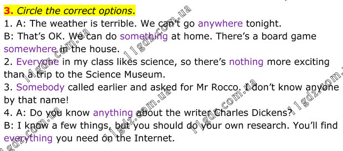 3. Circle the correct options. 1. A: The weather is terrible. We can’t go anywhere tonight. B: That’s OK. We can do something at home. There’s a board game somewhere in the house. 2. Everyone in my class likes science, so there’s nothing more exciting than a trip to the Science Museum. 3. Somebody called earlier and asked for Mr Rocco. I don’t know anyone by that name! 4. A: Do you know anything about the writer Charles Dickens? B: I know a few things, but you should do your own research. You’ll find everything you need on the Internet.
