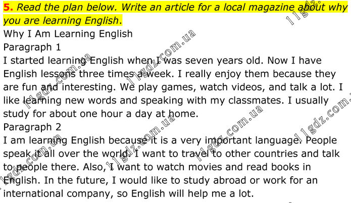 5. Read the plan below. Write an article for a local magazine about why you are learning English. Why I Am Learning English Paragraph 1 I started learning English when I was seven years old. Now I have English lessons three times a week. I really enjoy them because they are fun and interesting. We play games, watch videos, and talk a lot. I like learning new words and speaking with my classmates. I usually study for about one hour a day at home. Paragraph 2 I am learning English because it is a very important language. People speak it all over the world. I want to travel to other countries and talk to people there. Also, I want to watch movies and read books in English. In the future, I would like to study abroad or work for an international company, so English will help me a lot.