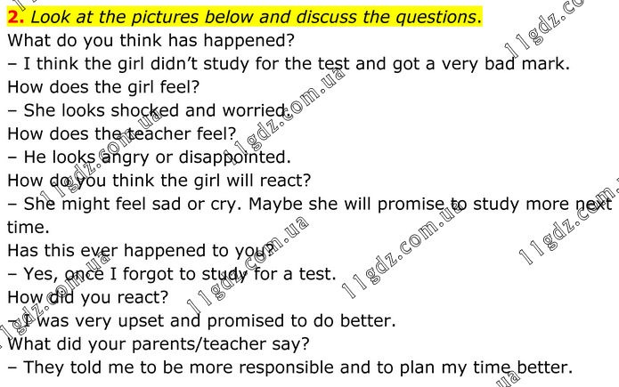 Look at the pictures below and discuss the questions. What do you think has happened? – I think the girl didn’t study for the test and got a very bad mark. How does the girl feel? – She looks shocked and worried. How does the teacher feel? – He looks angry or disappointed. How do you think the girl will react? – She might feel sad or cry. Maybe she will promise to study more next time. Has this ever happened to you? – Yes, once I forgot to study for a test. How did you react? – I was very upset and promised to do better. What did your parents/teacher say? – They told me to be more responsible and to plan my time better.