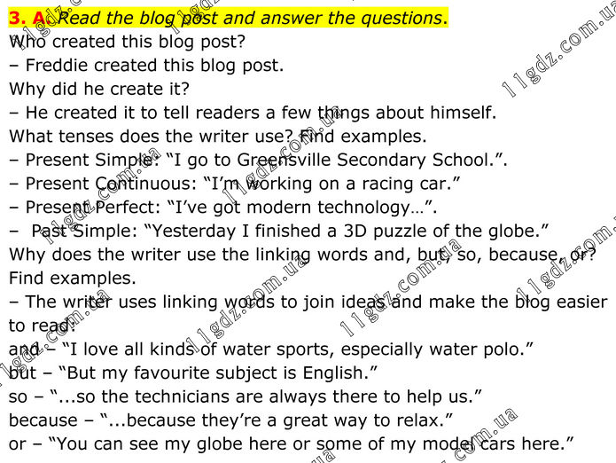 3. A. Read the blog post and answer the questions. Who created this blog post? – Freddie created this blog post. Why did he create it? – He created it to tell readers a few things about himself. What tenses does the writer use? Find examples. – Present Simple: “I go to Greensville Secondary School.”. – Present Continuous: “I’m working on a racing car.” – Present Perfect: “I’ve got modern technology…”. – Past Simple: “Yesterday I finished a 3D puzzle of the globe.” Why does the writer use the linking words and, but, so, because, or? Find examples. – The writer uses linking words to join ideas and make the blog easier to read: and – “I love all kinds of water sports, especially water polo.” but – “But my favourite subject is English.” so – “...so the technicians are always there to help us.” because – “...because they’re a great way to relax.” or – “You can see my globe here or some of my model cars here.”