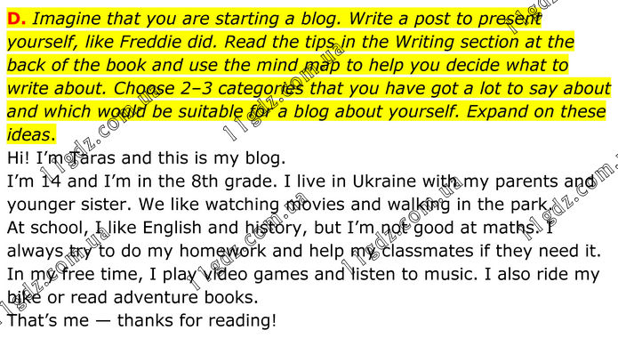 Imagine that you are starting a blog. Write a post to present yourself, like Freddie did. Read the tips in the Writing section at the back of the book and use the mind map to help you decide what to write about. Choose 2–3 categories that you have got a lot to say about and which would be suitable for a blog about yourself. Expand on these ideas. Hi! I’m Taras and this is my blog. I’m 14 and I’m in the 8th grade. I live in Ukraine with my parents and younger sister. We like watching movies and walking in the park. At school, I like English and history, but I’m not good at maths. I always try to do my homework and help my classmates if they need it. In my free time, I play video games and listen to music. I also ride my bike or read adventure books. That’s me — thanks for reading!