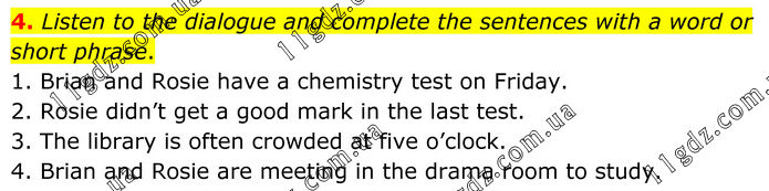 Listen to the dialogue and complete the sentences with a word or short phrase. 1. Brian and Rosie have a chemistry test on Friday. 2. Rosie didn’t get a good mark in the last test. 3. The library is often crowded at five o’clock. 4. Brian and Rosie are meeting in the drama room to study.