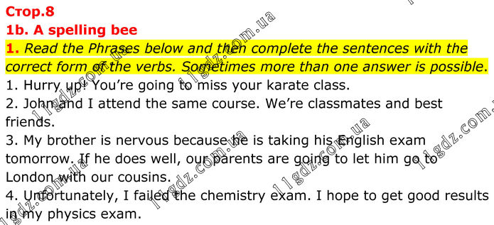 1. Read the Phrases below and then complete the sentences with the correct form of the verbs. Sometimes more than one answer is possible. 1. Hurry up! You’re going to miss your karate class. 2. John and I attend the same course. We’re classmates and best friends. 3. My brother is nervous because he is taking his English exam tomorrow. If he does well, our parents are going to let him go to London with our cousins. 4. Unfortunately, I failed the chemistry exam. I hope to get good results in my physics exam.