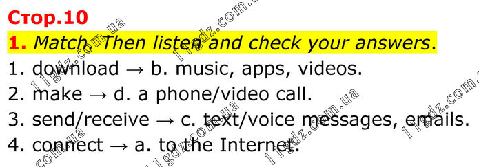 1. Match. Then listen and check your answers. 1. download → b. music, apps, videos. 2. make → d. a phone/video call. 3. send/receive → c. text/voice messages, emails. 4. connect → a. to the Internet.