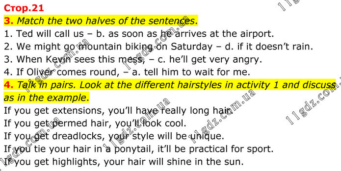 3. Match the two halves of the sentences. 1. Ted will call us – b. as soon as he arrives at the airport. 2. We might go mountain biking on Saturday – d. if it doesn’t rain. 3. When Kevin sees this mess, – c. he’ll get very angry. 4. If Oliver comes round, – a. tell him to wait for me. 4. Talk in pairs. Look at the different hairstyles in activity 1 and discuss as in the example. If you get extensions, you’ll have really long hair. If you get permed hair, you’ll look cool. If you get dreadlocks, your style will be unique. If you tie your hair in a ponytail, it’ll be practical for sport. If you get highlights, your hair will shine in the sun.