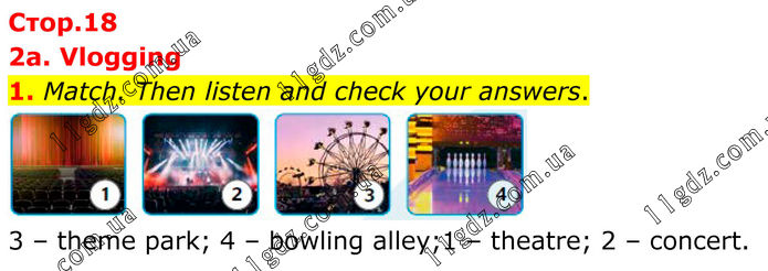 2a. Vlogging 1. Match. Then listen and check your answers. 3 – theme park; 4 – bowling alley;1 – theatre; 2 – concert.
