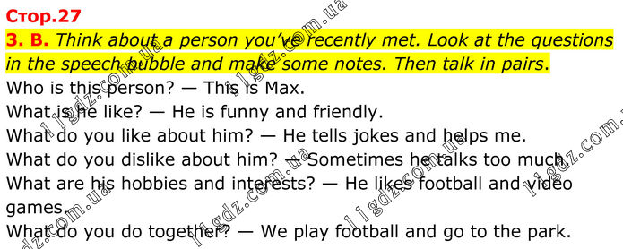 3. B. Think about a person you’ve recently met. Look at the questions in the speech bubble and make some notes. Then talk in pairs. Who is this person? — This is Max. What is he like? — He is funny and friendly. What do you like about him? — He tells jokes and helps me. What do you dislike about him? — Sometimes he talks too much. What are his hobbies and interests? — He likes football and video games. What do you do together? — We play football and go to the park.