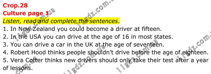 Culture page 1 Listen, read and complete the sentences. 1. In New Zealand you could become a driver at fifteen. 2. In the USA you can drive at the age of 16 in most states. 3. You can drive a car in the UK at the age of seventeen. 4. Robert Hood thinks people shouldn’t drive before the age of eighteen. 5. Vera Cotter thinks new drivers should only take their test after a year of lessons.