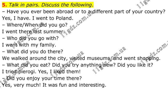 5. Talk in pairs. Discuss the following. – Have you ever been abroad or to a different part of your country? Yes, I have. I went to Poland. – Where/When did you go? I went there last summer. – Who did you go with? I went with my family. – What did you do there? We walked around the city, visited museums, and went shopping. – What did you eat? Did you try anything new? Did you like it? I tried pierogi. Yes, I liked them! – Did you enjoy your time there? Yes, very much! It was fun and interesting.