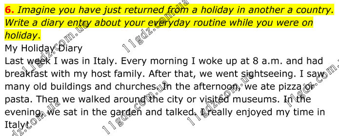 6. Imagine you have just returned from a holiday in another a country. Write a diary entry about your everyday routine while you were on holiday. My Holiday Diary Last week I was in Italy. Every morning I woke up at 8 a.m. and had breakfast with my host family. After that, we went sightseeing. I saw many old buildings and churches. In the afternoon, we ate pizza or pasta. Then we walked around the city or visited museums. In the evening, we sat in the garden and talked. I really enjoyed my time in Italy!