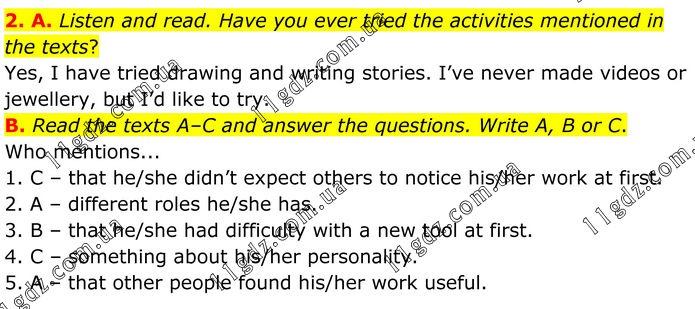 2. A. Listen and read. Have you ever tried the activities mentioned in the texts? Yes, I have tried drawing and writing stories. I’ve never made videos or jewellery, but I’d like to try. B. Read the texts A–C and answer the questions. Write A, B or C. Who mentions... 1. C – that he/she didn’t expect others to notice his/her work at first. 2. A – different roles he/she has. 3. B – that he/she had difficulty with a new tool at first. 4. C – something about his/her personality. 5. A – that other people found his/her work useful.