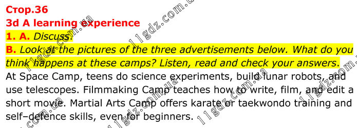 3d A learning experience 1. A. Discuss. B. Look at the pictures of the three advertisements below. What do you think happens at these camps? Listen, read and check your answers. At Space Camp, teens do science experiments, build lunar robots, and use telescopes. Filmmaking Camp teaches how to write, film, and edit a short movie. Martial Arts Camp offers karate or taekwondo training and self–defence skills, even for beginners.