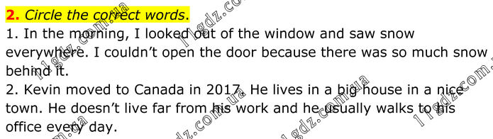2. Circle the correct words. 1. In the morning, I looked out of the window and saw snow everywhere. I couldn’t open the door because there was so much snow behind it. 2. Kevin moved to Canada in 2017. He lives in a big house in a nice town. He doesn’t live far from his work and he usually walks to his office every day.