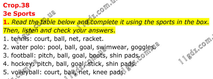 3e Sports 1. Read the table below and complete it using the sports in the box. Then, listen and check your answers. 1. tennis: court, ball, net, racket. 2. water polo: pool, ball, goal, swimwear, goggles. 3. football: pitch, ball, goal, boots, shin pads. 4. hockey: pitch, ball, goal, stick, shin pads. 5. volleyball: court, ball, net, knee pads.