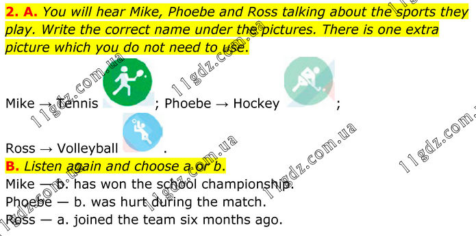 2. A. You will hear Mike, Phoebe and Ross talking about the sports they play. Write the correct name under the pictures. There is one extra picture which you do not need to use. Mike → Tennis ; Phoebe → Hockey ; Ross → Volleyball . B. Listen again and choose a or b. Mike — b. has won the school championship. Phoebe — b. was hurt during the match. Ross — a. joined the team six months ago.