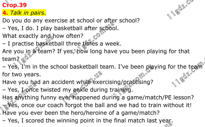 4. Talk in pairs. Do you do any exercise at school or after school? – Yes, I do. I play basketball after school. What exactly and how often? – I practise basketball three times a week. Are you in a team? If yes, how long have you been playing for that team? – Yes, I’m in the school basketball team. I’ve been playing for the team for two years. Have you had an accident while exercising/practising? – Yes, I once twisted my ankle during training. Has anything funny ever happened during a game/match/PE lesson? – Yes, once our coach forgot the ball and we had to train without it! Have you ever been the hero/heroine of a game/match? – Yes, I scored the winning point in the final match last year.