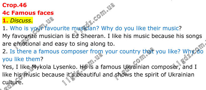 4c Famous faces 1. Discuss. 1. Who is your favourite musician? Why do you like their music? My favourite musician is Ed Sheeran. I like his music because his songs are emotional and easy to sing along to. 2. Is there a famous composer from your country that you like? Why do you like them? Yes, I like Mykola Lysenko. He is a famous Ukrainian composer, and I like his music because it’s beautiful and shows the spirit of Ukrainian culture.