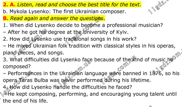 2. A. Listen, read and choose the best title for the text. b. Mykola Lysenko: The first Ukrainian composer. B. Read again and answer the questions. 1. When did Lysenko decide to become a professional musician? – After he got his degree at the University of Kyiv. 2. How did Lysenko use traditional songs in his work? – He mixed Ukrainian folk tradition with classical styles in his operas, piano pieces, and songs. 3. What difficulties did Lysenko face because of the kind of music he composed? – Performances in the Ukrainian language were banned in 1876, so his opera Taras Bulba was never performed during his lifetime. 4. How did Lysenko handle the difficulties he faced? – He kept composing, performing, and encouraging young talent until the end of his life.
