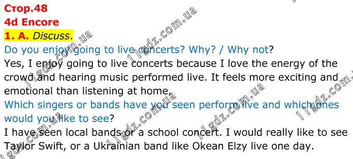 4d Encore 1. A. Discuss. Do you enjoy going to live concerts? Why? / Why not? Yes, I enjoy going to live concerts because I love the energy of the crowd and hearing music performed live. It feels more exciting and emotional than listening at home. Which singers or bands have you seen perform live and which ones would you like to see? I have seen local bands or a school concert. I would really like to see Taylor Swift, or a Ukrainian band like Okean Elzy live one day.
