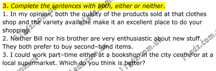 3. Complete the sentences with both, either or neither. 1. In my opinion, both the quality of the products sold at that clothes shop and the variety available make it an excellent place to do your shopping. 2. Neither Bill nor his brother are very enthusiastic about new stuff. They both prefer to buy second–hand items. 3. I could work part–time either at a bookshop in the city centre or at a local supermarket. Which do you think is better?