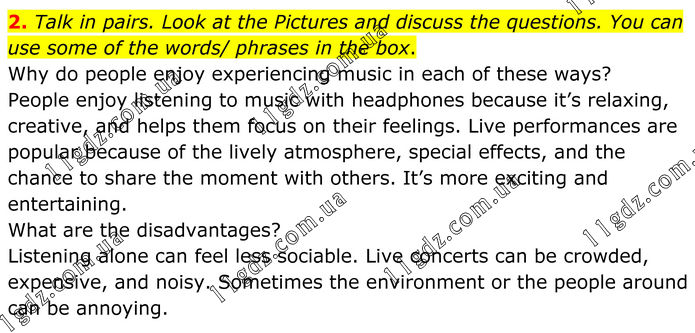 2. Talk in pairs. Look at the Pictures and discuss the questions. You can use some of the words/ phrases in the box. Why do people enjoy experiencing music in each of these ways? People enjoy listening to music with headphones because it’s relaxing, creative, and helps them focus on their feelings. Live performances are popular because of the lively atmosphere, special effects, and the chance to share the moment with others. It’s more exciting and entertaining. What are the disadvantages? Listening alone can feel less sociable. Live concerts can be crowded, expensive, and noisy. Sometimes the environment or the people around can be annoying.