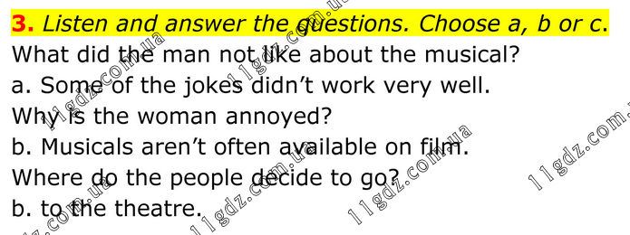 3. Listen and answer the questions. Choose a, b or c. What did the man not like about the musical? a. Some of the jokes didn’t work very well. Why is the woman annoyed? b. Musicals aren’t often available on film. Where do the people decide to go? b. to the theatre.