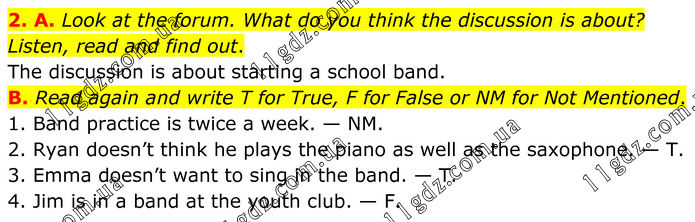 2. A. Look at the forum. What do you think the discussion is about? Listen, read and find out. The discussion is about starting a school band. B. Read again and write T for True, F for False or NM for Not Mentioned. 1. Band practice is twice a week. — NM. 2. Ryan doesn’t think he plays the piano as well as the saxophone. — T. 3. Emma doesn’t want to sing in the band. — T. 4. Jim is in a band at the youth club. — F.