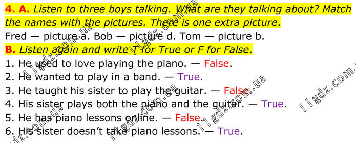 4. A. Listen to three boys talking. What are they talking about? Match the names with the pictures. There is one extra picture. Fred — picture a. Bob — picture d. Tom — picture b. B. Listen again and write T for True or F for False. 1. He used to love playing the piano. — False. 2. He wanted to play in a band. — True. 3. He taught his sister to play the guitar. — False. 4. His sister plays both the piano and the guitar. — True. 5. He has piano lessons online. — False. 6. His sister doesn’t take piano lessons. — True.
