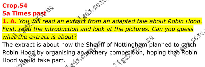 5a Times past 1. A. You will read an extract from an adapted tale about Robin Hood. First, read the introduction and look at the pictures. Can you guess what the extract is about? The extract is about how the Sheriff of Nottingham planned to catch Robin Hood by organising an archery competition, hoping that Robin Hood would take part.