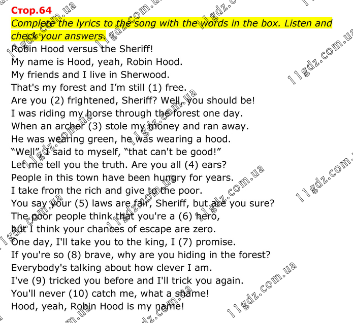 Complete the lyrics to the song with the words in the box. Listen and check your answers. Robin Hood versus the Sheriff! My name is Hood, yeah, Robin Hood. My friends and I live in Sherwood. That's my forest and I’m still (1) free. Are you (2) frightened, Sheriff? Well, you should be! I was riding my horse through the forest one day. When an archer (3) stole my money and ran away. He was wearing green, he was wearing a hood. “Well”, I said to myself, “that can't be good!” Let me tell you the truth. Are you all (4) ears? People in this town have been hungry for years. I take from the rich and give to the poor. You say your (5) laws are fair, Sheriff, but are you sure? The poor people think that you're a (6) hero, but I think your chances of escape are zero. One day, I'll take you to the king, I (7) promise. If you're so (8) brave, why are you hiding in the forest? Everybody's talking about how clever I am. I've (9) tricked you before and I'll trick you again. You'll never (10) catch me, what a shame! Hood, yeah, Robin Hood is my name!