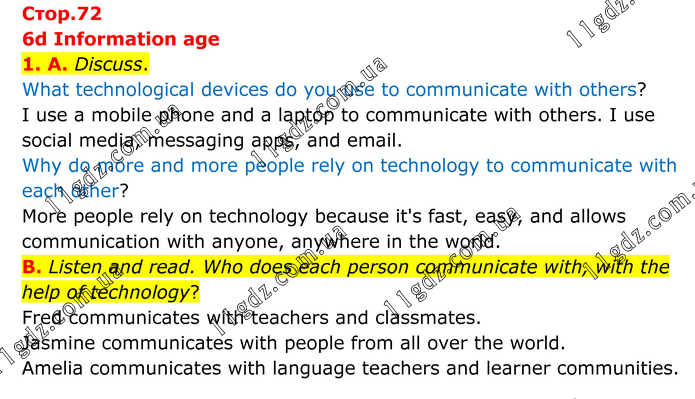 6d Information age 1. A. Discuss. What technological devices do you use to communicate with others? I use a mobile phone and a laptop to communicate with others. I use social media, messaging apps, and email. Why do more and more people rely on technology to communicate with each other? More people rely on technology because it's fast, easy, and allows communication with anyone, anywhere in the world. B. Listen and read. Who does each person communicate with, with the help of technology? Fred communicates with teachers and classmates. Jasmine communicates with people from all over the world. Amelia communicates with language teachers and learner communities.