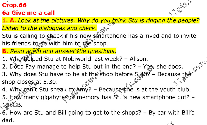 6a Give me a call 1. A. Look at the pictures. Why do you think Stu is ringing the people? Listen to the dialogues and check. Stu is calling to check if his new smartphone has arrived and to invite his friends to go with him to the shop. B. Read again and answer the questions. 1. Who helped Stu at Mobiworld last week? – Alison. 2. Does Fay manage to help Stu out in the end? – Yes, she does. 3. Why does Stu have to be at the shop before 5.30? – Because the shop closes at 5.30. 4. Why can’t Stu speak to Amy? – Because she is at the youth club. 5. How many gigabytes of memory has Stu’s new smartphone got? – 128GB. 6. How are Stu and Bill going to get to the shops? – By car with Bill’s dad.