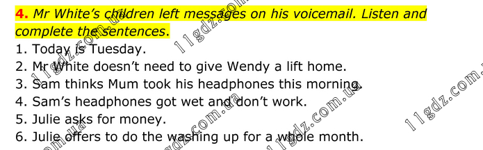 Mr White’s children left messages on his voicemail. Listen and complete the sentences. 1. Today is Tuesday. 2. Mr White doesn’t need to give Wendy a lift home. 3. Sam thinks Mum took his headphones this morning. 4. Sam’s headphones got wet and don’t work. 5. Julie asks for money. 6. Julie offers to do the washing up for a whole month.