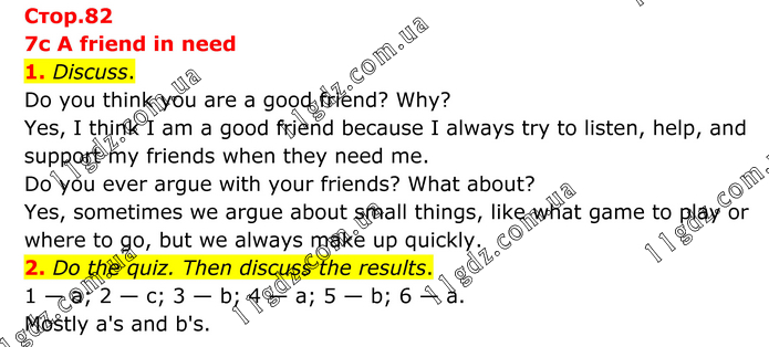 7c A friend in need 1. Discuss. Do you think you are a good friend? Why? Yes, I think I am a good friend because I always try to listen, help, and support my friends when they need me. Do you ever argue with your friends? What about? Yes, sometimes we argue about small things, like what game to play or where to go, but we always make up quickly. 2. Do the quiz. Then discuss the results. 1 — a; 2 — c; 3 — b; 4 — a; 5 — b; 6 — a. Mostly a's and b's.