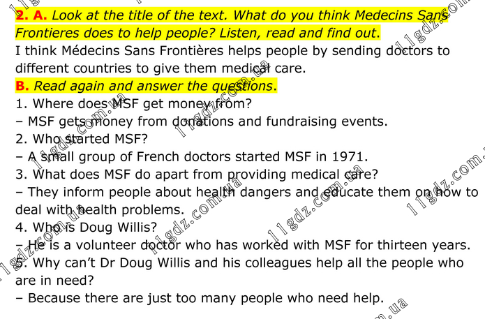 A. Look at the title of the text. What do you think Medecins Sans Frontieres does to help people? Listen, read and find out. I think Médecins Sans Frontières helps people by sending doctors to different countries to give them medical care. B. Read again and answer the questions. 1. Where does MSF get money from? – MSF gets money from donations and fundraising events. 2. Who started MSF? – A small group of French doctors started MSF in 1971. 3. What does MSF do apart from providing medical care? – They inform people about health dangers and educate them on how to deal with health problems. 4. Who is Doug Willis? – He is a volunteer doctor who has worked with MSF for thirteen years. 5. Why can’t Dr Doug Willis and his colleagues help all the people who are in need? – Because there are just too many people who need help.